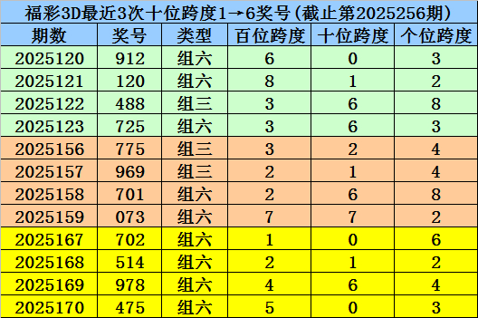 第2025156-第2025158期奖号:775、969、701,其下期奖号为:073,中位号码跨度为7;