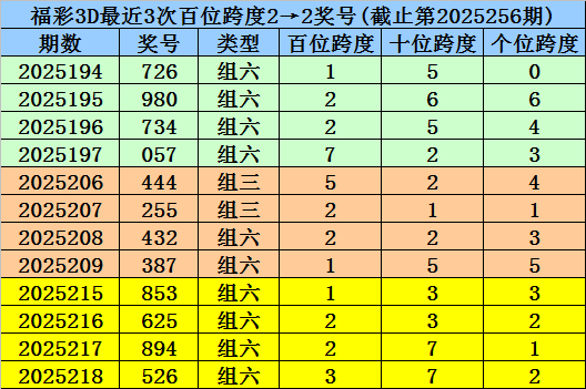 第2025206-第2025208期奖号:444、255、432,其下期奖号为:387,首位号码跨度为1;