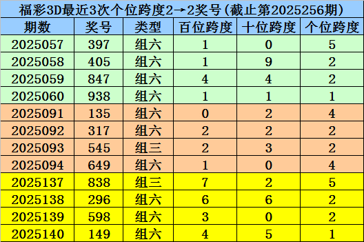 首位跨度分析:首位号码最近3期奖号为0-2-4,连续两期跨度为2、2,历史上首位号码连续两期分别开出跨度2、2的现象共出现258次,其前两次开出奖号分别为: