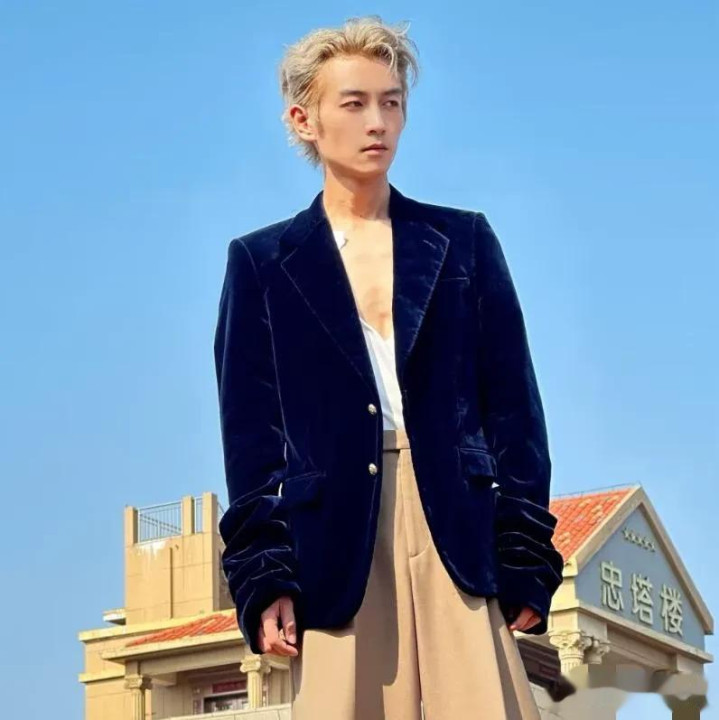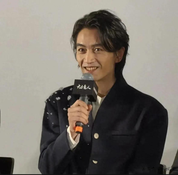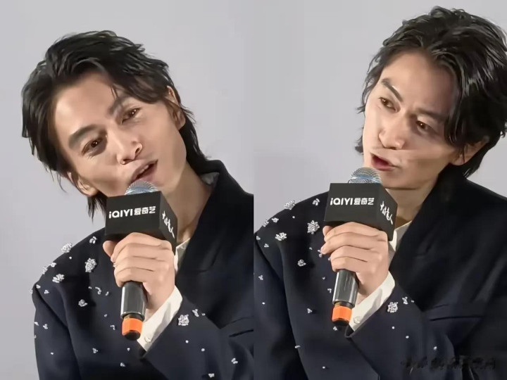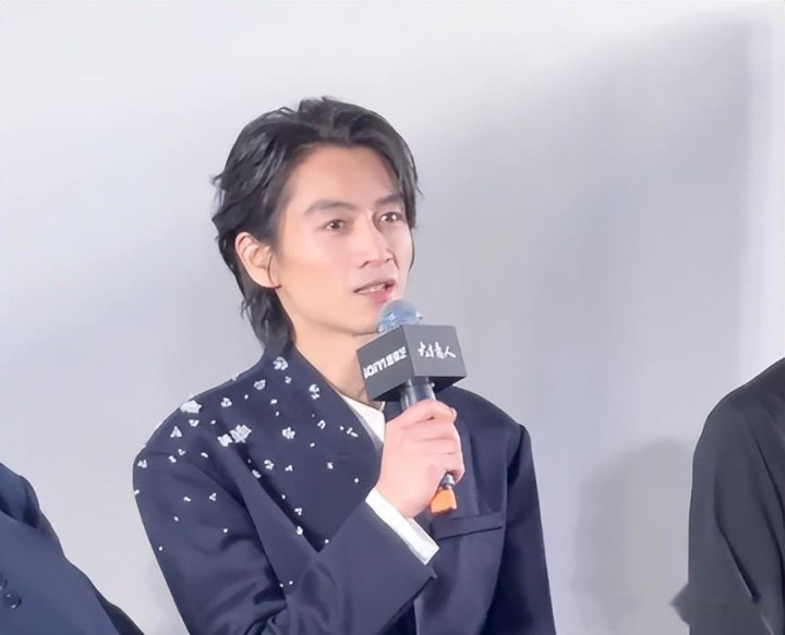 精修图里,他留着微卷齐肩的狼尾长发,黑西装肩宽腰窄,帅得像韩国男团成员,一眼就让人想起杨过。