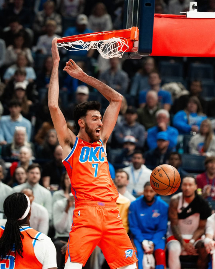 雷霆队官方ins发布图片。图中显示杰伦·威廉姆斯与切特·霍姆格伦的赛场精彩瞬间。