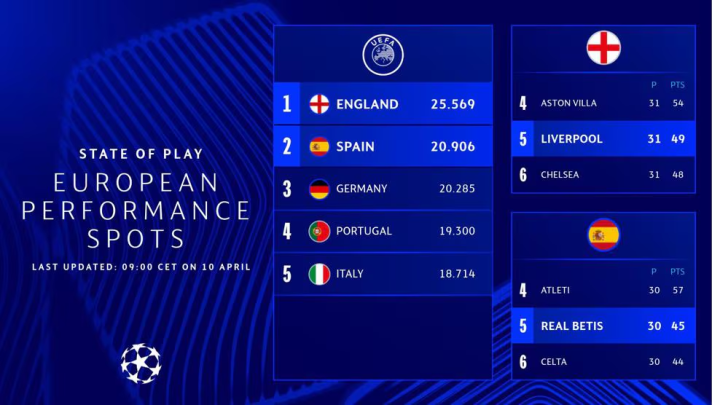 由于英格兰和西班牙在2025/26赛季本就拥有4个自动参赛名额,这意味着英超和西甲的第五名也能确保获得联赛阶段的席位。