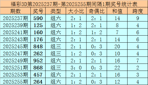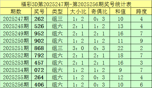 其中大小比1:2,奇偶比0:3,和值10,跨度6。