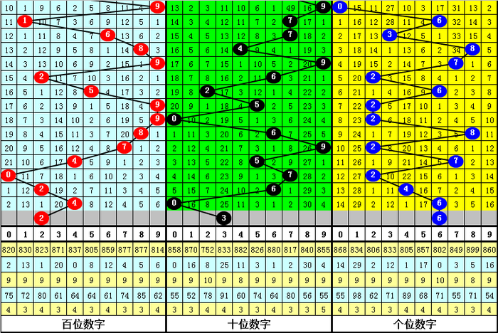 组选分析:在0-9的组选分布图中,最近10期0-2区段开出11个号码,3-6区段开出11个号码,7-9区段开出8个号码,上期7-9区间没有落号,本期重防前端号码热出,注意7-9号码断区。