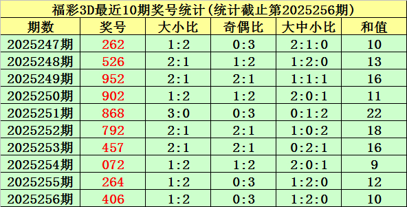 开奖回顾:福彩3D第2025256期奖号为:406。奖号类型为组六,和值为10,奇偶比为0:3,跨度为6,012路比为2:1:0,大小比为1:2。