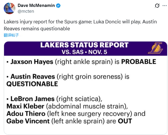 北京时间11月5日,NBA常规赛继续进行,湖人官方公布下一场对阵马刺的伤病报告,詹姆斯等四人继续休战,东契奇确定复出,里夫斯大概率回归。