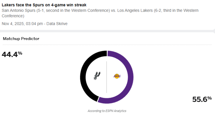 湖人正处于四连胜的大好局面之中,东契奇将带队大战文班亚马,对于明日湖人对阵马刺,ESPN预测湖人赢球概率为55.6%,马刺赢球概率为44.4%。